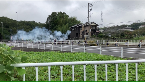 駐車場の草取りをしていると、「エイサ、オイサ!」という掛け声が聞こえてきました。