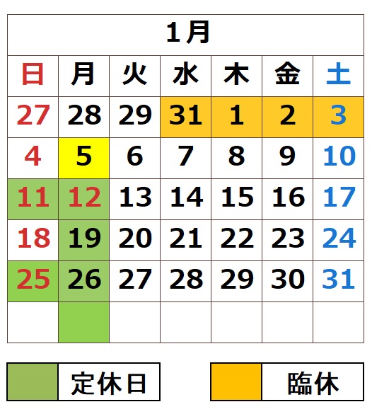 2026年1月カレンダ 1/4(日)から営業1/5(月)も営業です