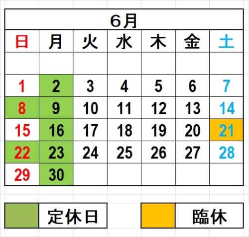 2025年6月カレンダ 6/21 6/22 お休みです。