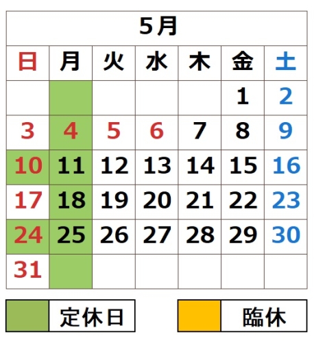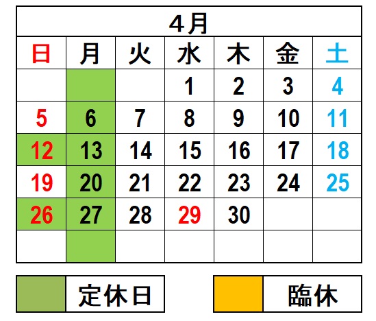 2026年4月カレンダ 臨時休業【6/20土 6/21日 9/5土 9/6日】